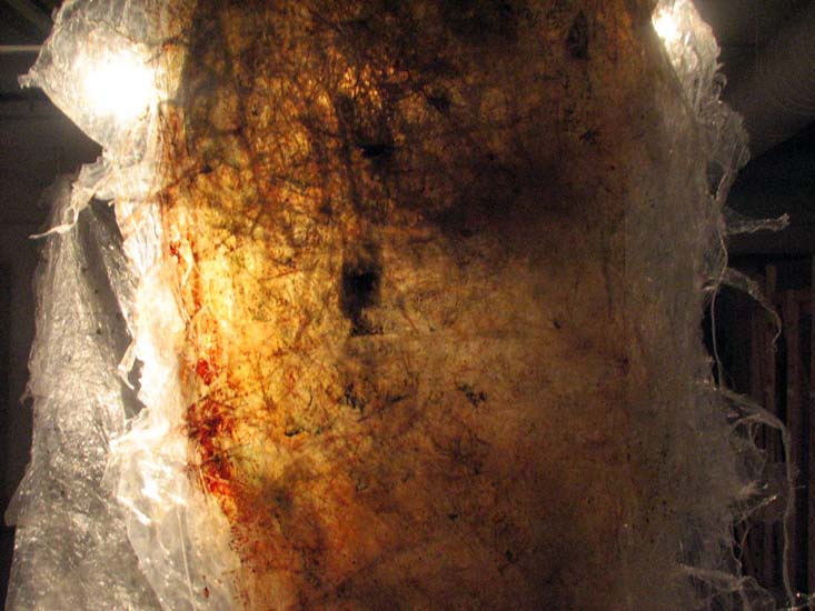 Plastic Paintings: Bodily Fluids 6, acrylic in plastic wrap sculpture, photograph of installation.