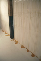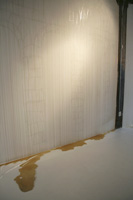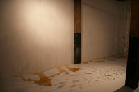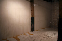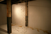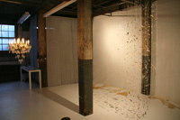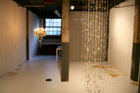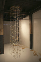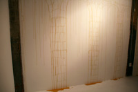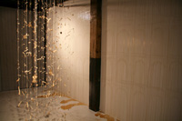 Indicator was a three person installation exhibition presented for Toronto Nuit Blanche 2013. Indicator species such as Birds, bats and bees signal the deteriorated state of ecosystems, warning us when our environs are in trouble. These three installations investigate the concept of biological indicators and the suffering of wildlife due to habitat destruction, climate change, and environmental contamination. Jessica Marion Barr's "Augury : Elegy" formed a rain cloud of bird bones. Karen Abel's "Hibernaculum" was a chandelier inhabited by crystalline cast-sugar bats. Encircling the space was Gareth Bate's ghostly "Colony Collapse" an amphitheatre-like wall mural of the ancient Roman Coliseum and aquiducts hand drawn with liquid honey. The honey gradually slid down the walls leaving a ghostly image and pools on the floor. Read more