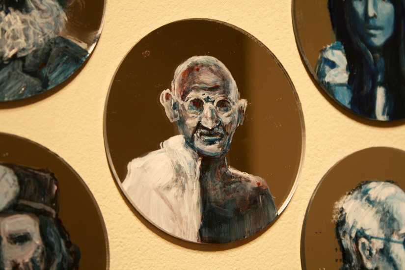 Detail: Mohandas Gandhi, Jewel Net of Indra installation, 1000 acrylic mirrors with 325 acrylic painted portraits, Aug. 2011 - present, photo: Gareth Bate.
