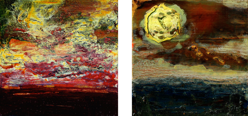 | Moments: Red Sunset Blazing Sun, acrylic on wood, 2 Paintings: 8 x 8 inches, Feb.-Dec. 2010, available. Return to Painting Menu | Return to Moments Menu | Artist Statement |