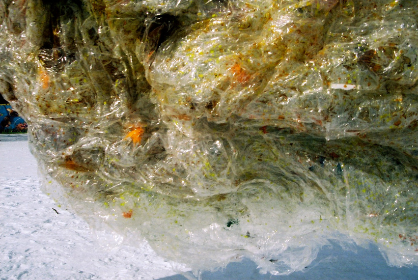| Detail: Plastic Painting: Snow Installations: Grange Park, Toronto, acrylic paint in plastic cling wrap over, 2007. Return to Installation Menu | Return to Snow & Ice Installation Menu | Artist Statement |