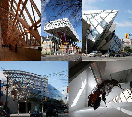 Photos by Gareth Bate: Frank Gehry's Art Gallery of Ontario interior, Will Alsop's Ontario College of Art & Design, Daniel Liebeskind's Royal Ontario Museum, AGO exterior, ROM interior.
