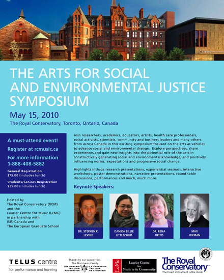 Join researchers, academics, educators, artists, health care professionals, social activists, scientists, community and business leaders and many others from across Canada in this exciting symposium focused on the arts as vehicles to advance social and environmental change. Explore perspectives, share experiences and gain new insights into the potential role of the arts in constructively generating social and environmental knowledge, and positively influencing norms, expectations and progressive social change.