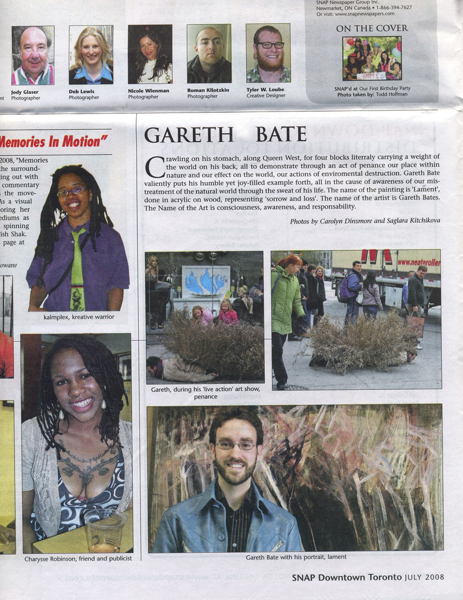 Crawling on his stomach, along Queen West, for four blocks literraly carrying a weight of the world on his back, all to demonstrate through an act of penance our place within nature and our effect on the world, our actions of environmental destruction. Gareth Bate valiently puts his humble yet joy-filled example forth, all in the cause of awareness of our mistreatment of the natural world through the sweat of his life. Th ename of the painting is "Lament" done in acrylic on wood, representing 'sorrow and loss.' The name of the artist is Gareth Bate. The Name of the Art is consciousness, awareness , and responsability.