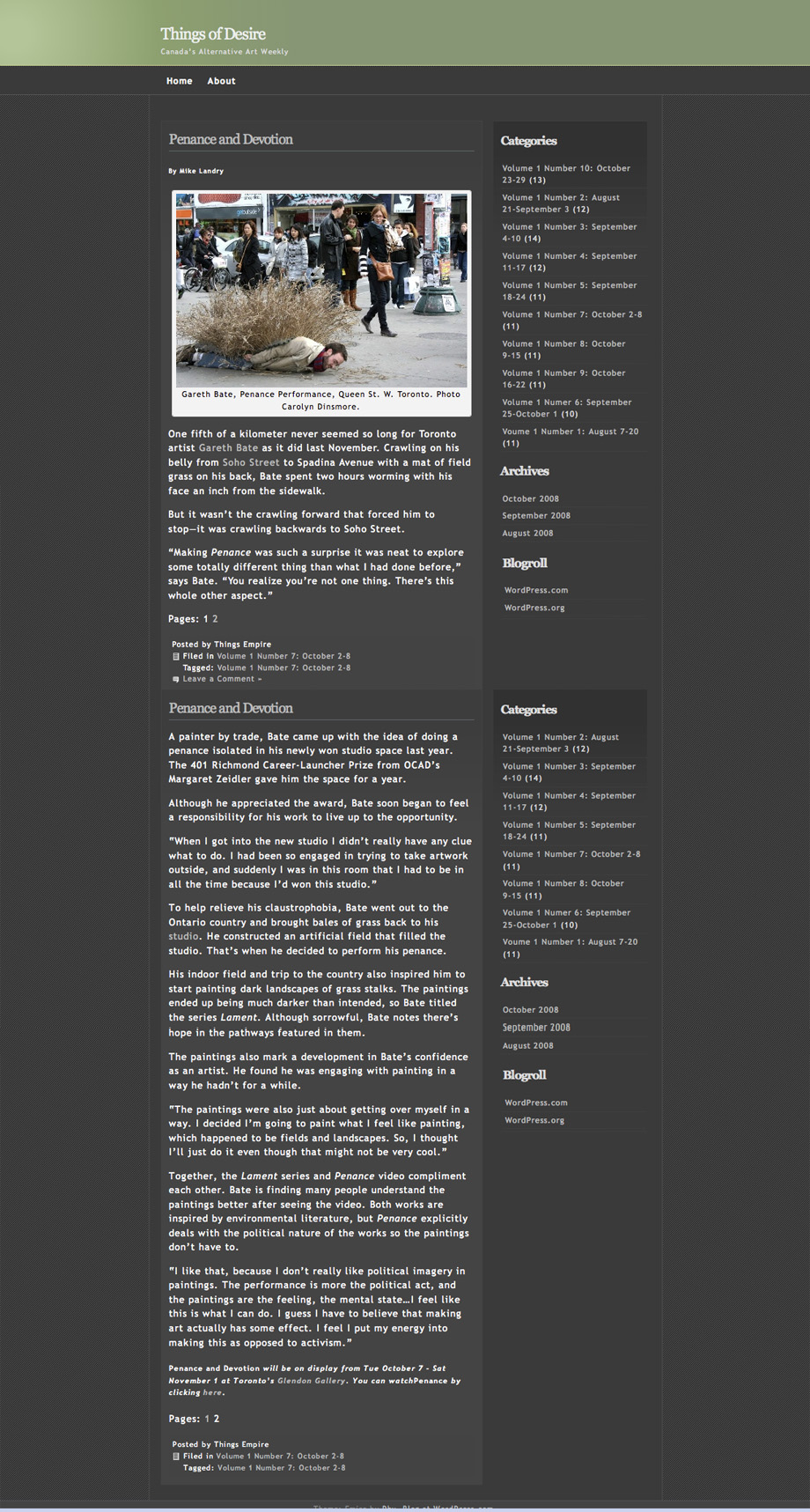One fifth of a kilometer never seemed so long for Toronto artist Gareth Bate as it did last November. Crawling on his belly from Soho Street to Spadina Avenue with a mat of field grass on his back, Bate spent two hours worming with his face an inch from the sidewalk.