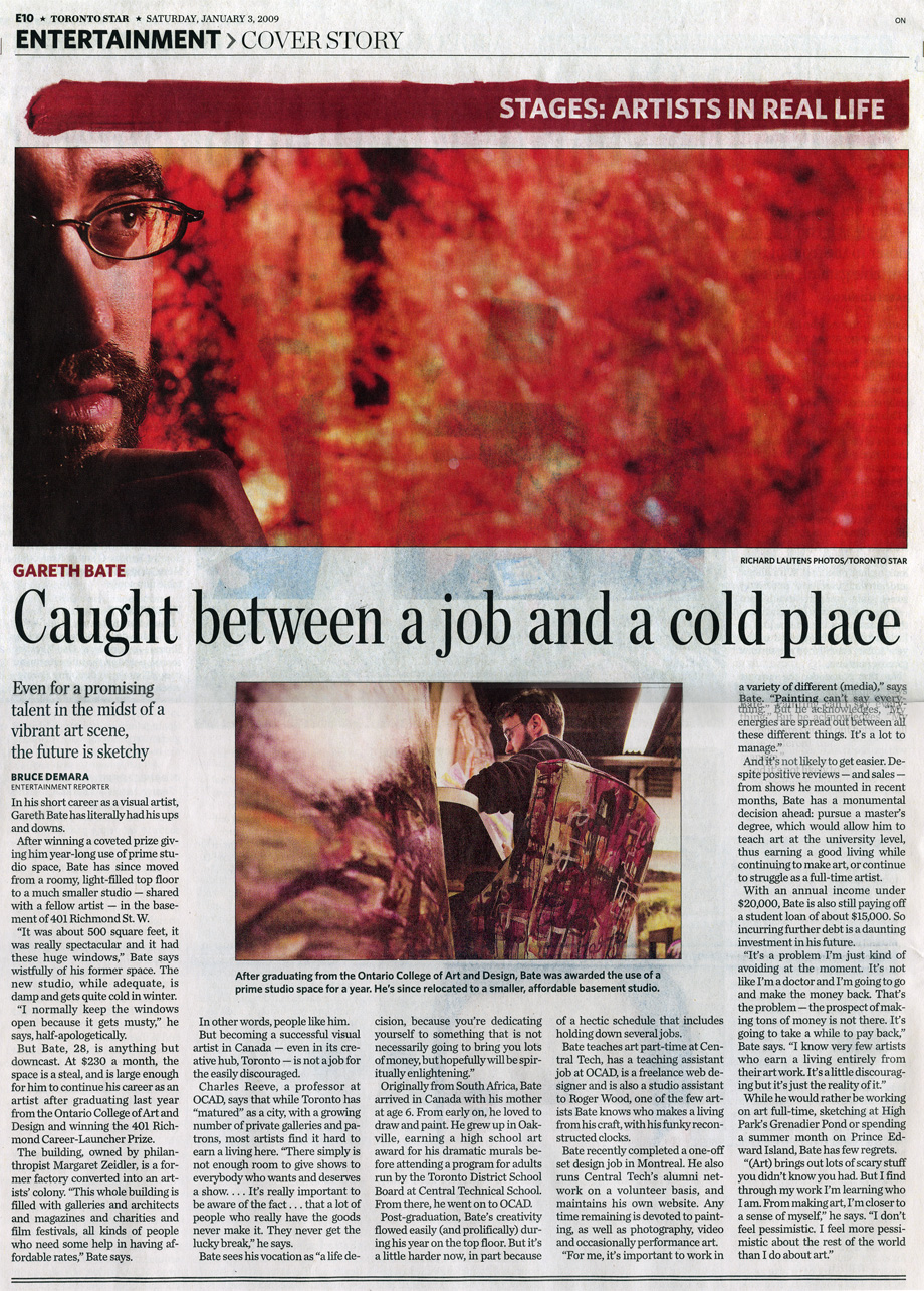 But Bate, 28, is anything but downcast. At $230 a month, the space is a steal, and is large enough for him to continue his career as an artist after graduating last year from the Ontario College of Art and Design and winning the 401 Richmond Career-Launcher Prize.